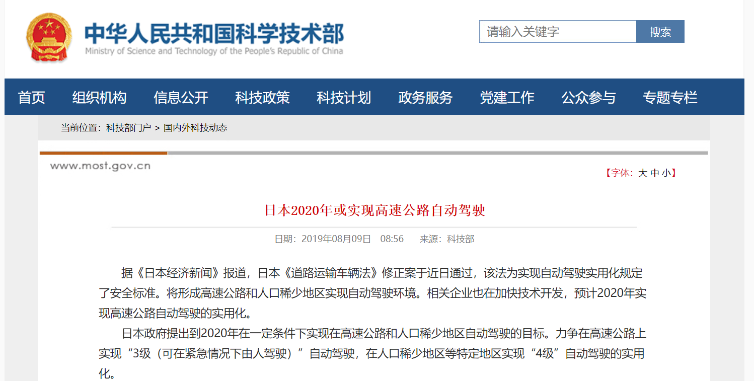 2丨日本:2020年或实现高速公路自动驾驶。据科技部援引日本经济新闻报道,日本《道路运输车辆法》修正案于近日通过,该法为实现自动驾驶实用化规定了安全标准。将形成高速公路和人口稀少地区实现自动驾驶环境。相关企业也在加快技术开发,预计2020年实现高速公路自动驾驶的实用化。