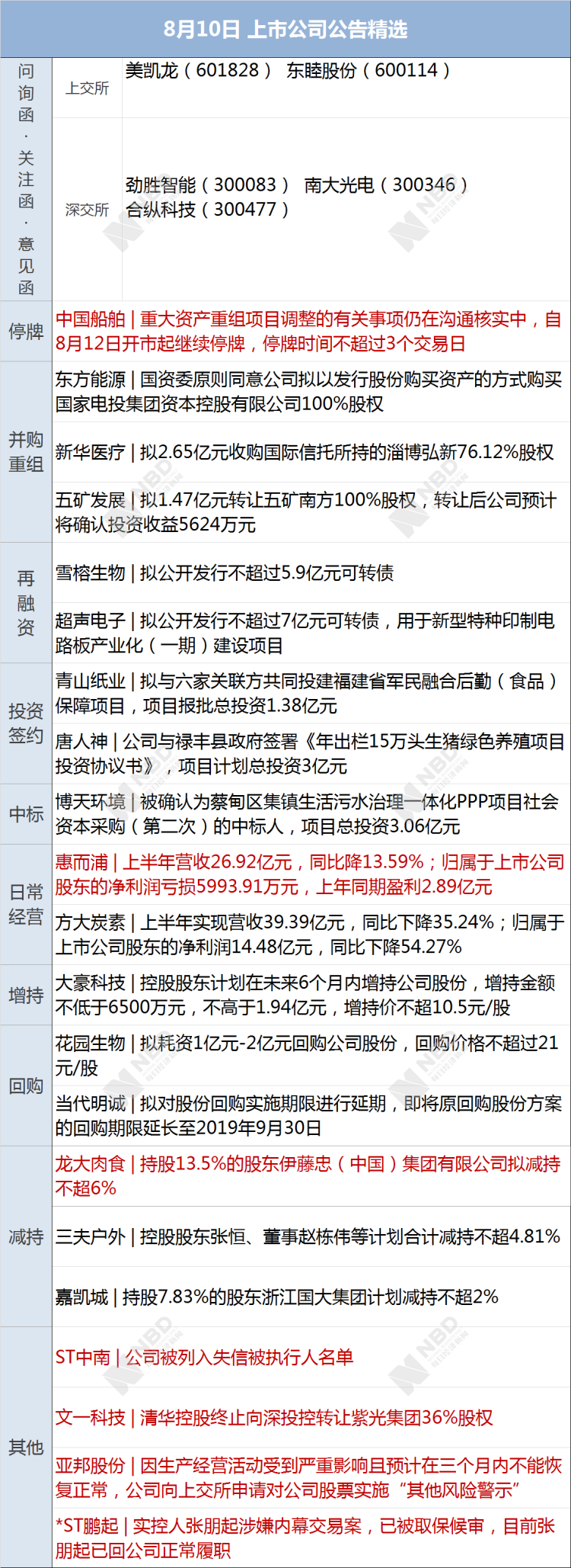 1丨纽威股份:8月9日,上交所公布了对纽威股份(603699)实控人予以通报批评的决定。上交所称,纽威股份实控人王保庆、陆斌、程章文、席超拟自2018年6月25日起6个月内增持公司股份,合计增持金额不低于6000万元、不高于1.6亿元。但直至增持计划实施期限届满,王保庆等四人合计增持约920.40万元,仅达到计划最低增持金额的15.34%,并决定终止实施前述增持计划。