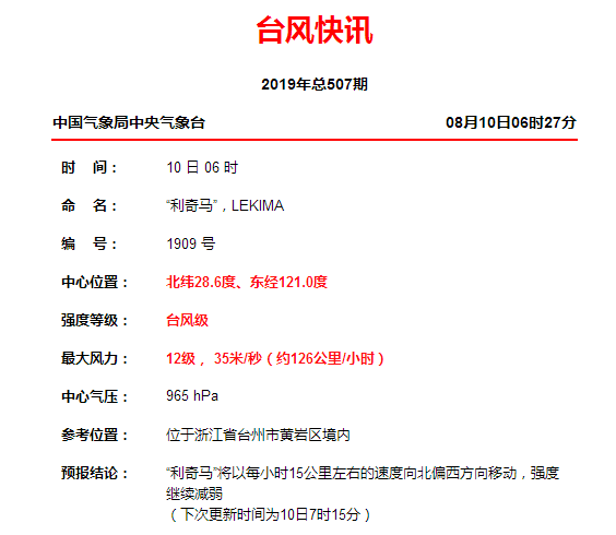 中央气象台8月10日6时27分发布台风快讯,“利奇马”(台风级)位于台州市黄岩区境内,最大风力:12级(35米/秒),中心最低气压965hPa,将以每小时15公里左右的速度向北偏西方向移动,强度继续减弱。