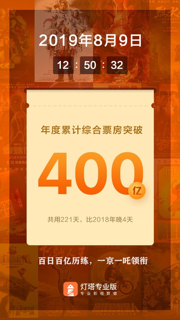 11丨2019年度累计票房:突破400亿。据每日经济新闻,灯塔专业版数据显示,截止2019年8月9日12:50,年度累计综合票房突破400亿元,比2018年晚4天。2019年年度票房前三甲分别为《流浪地球》《复仇者联盟4:终局之战》和《哪吒之魔童降世》,分别斩获票房46.56亿元、42.38亿元和30.89亿元。