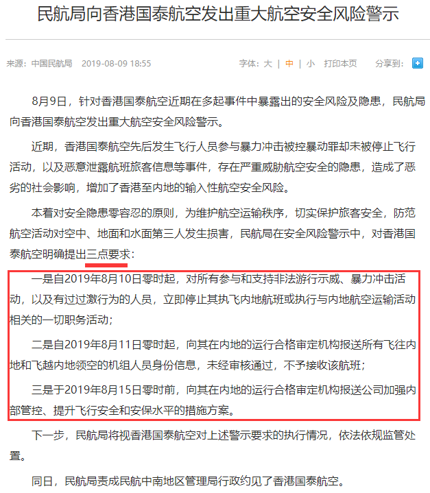 2丨民航局:向香港国泰航空发出重大航空安全风险警示。8月9日,针对香港国泰航空近期在多起事件中暴露出的安全风险及隐患,民航局向香港国泰航空发出重大航空安全风险警示。