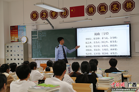 昭平县税务局“青税”老师为昭平县职业教育中心学生领学《税收三字经》。昭平县税务局供图