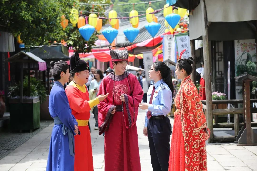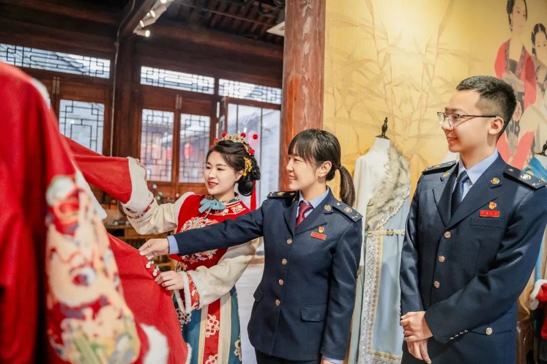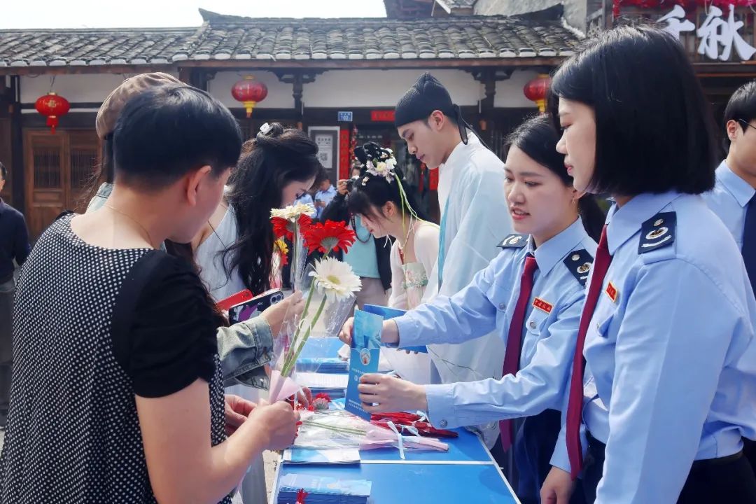 在福建,国家税务总局三明市沙县区税务局青年干部身着汉服古装,前往沙县东门古街旅游景区开展“古韵传税声 青春燃税月”活动,为来往游客普及税惠知识。