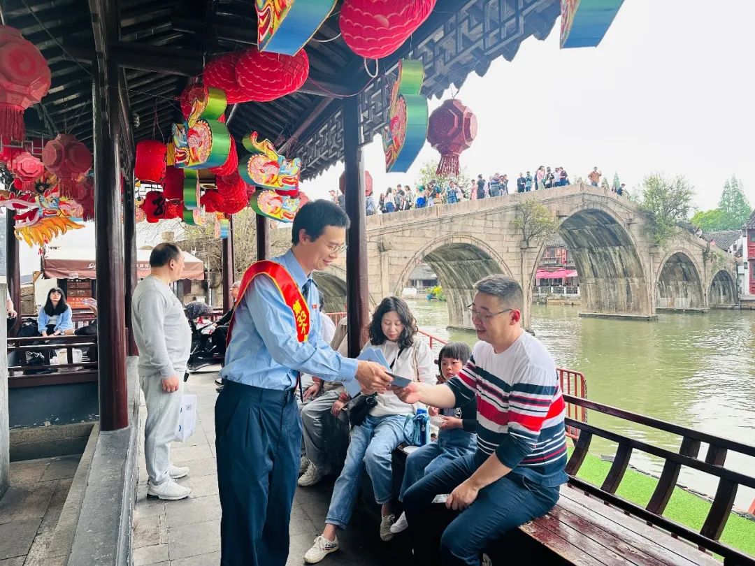 在上海,国家税务总局上海市青浦区税务局税宣小分队走进朱家角古镇,向往来游客分发税收宣传资料,并讲解个税年度汇算热点政策,解答纳税人个性化问题。