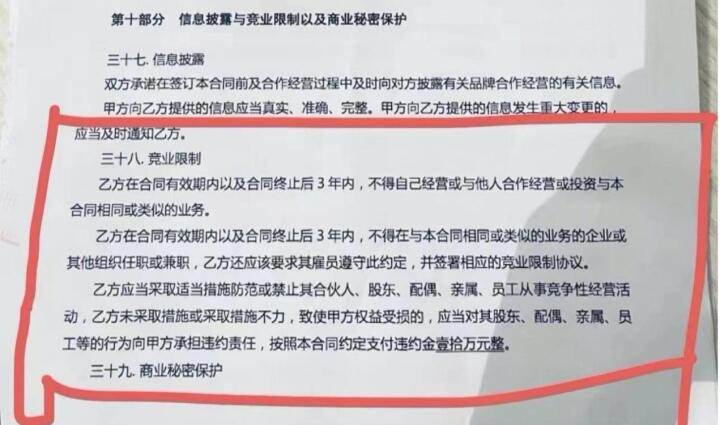 比如,新版合同第十部分《信息披露与竞业限制以及商业保护》第三十八条中提到,加盟商在合同有效期内以及合同终止后3年,不得从事类似业务,其雇员也应遵守此约定。违约金为10万元整。