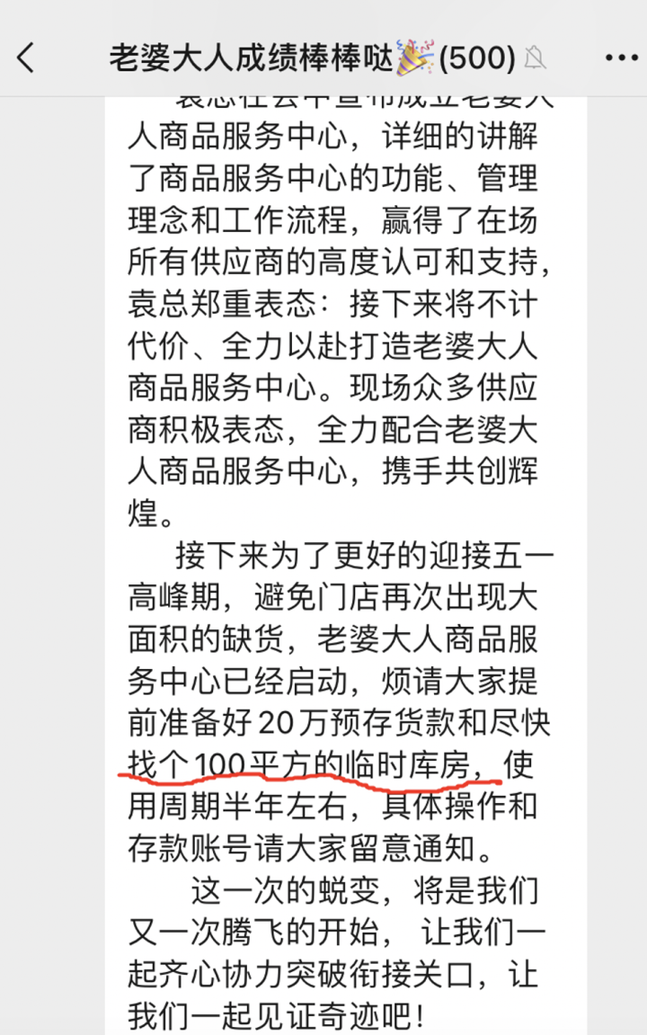 在“老婆大人”与加盟商互动的微信群中,微信名为“老婆大人营运服务号”的发消息,要求加盟商在48小时内转来20万预付货款,并租用使用周期半年左右的100平方米临时库房。