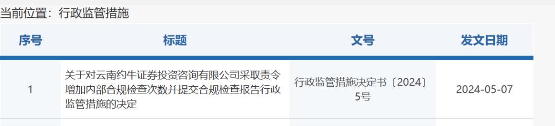 5月7 日,证监会官网公布一张针对约牛证券咨询的行政监管措施决定书。