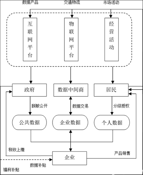 “数据二十条”的基本特征是构建中国特色社会主义数据产权,在“数据资源持有权、数据加工使用权、数据产品经营权”的权属划分上实现“三权分置”[2],通过数据产权分离,实现淡化所有权、强调使用权、协调多元数据主体行为,以建立符合中国国情的数据要素市场制度。在“数据二十条”中,还明确提出了要推动建立“公共数据、企业数据和个人数据”三类确权授权机制的要求,并要兼顾个人隐私保护、企业创新激励和社会福利最大化。同时, “数据二十条”还强调了政府在数据要素收益分配中的引导调节作用[3]。