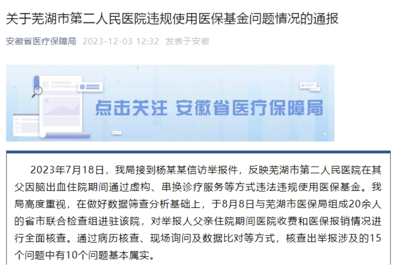 据通报,2023年7月18日安徽省医保局接到杨某某信访举报件,反映芜湖市第二人民医院在其父因脑出血住院期间通过虚构、串换诊疗服务等方式违法违规使用医保基金。