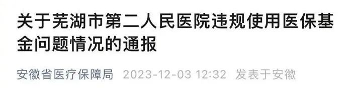 安徽省医疗保障局12月3日发布关于芜湖市第二人民医院违规使用医保基金问题情况的通报: