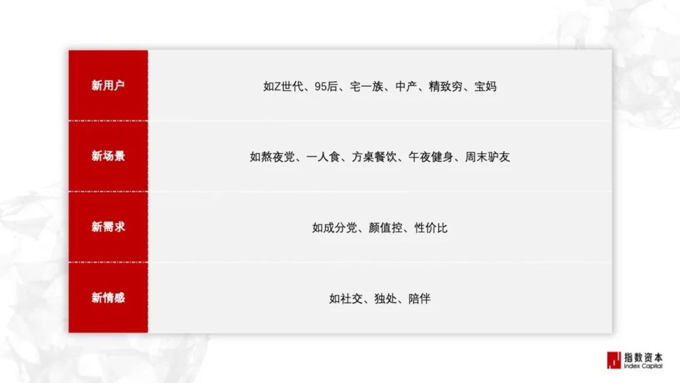 ▲新消费品牌很多是在一个大品类中切割出了一个具有独特差异化功能、特性的细分领域(图源:指数资本)