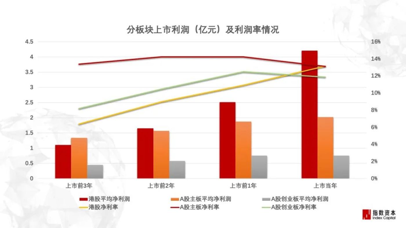整体来看,港股上市公司收入规模最高,上市当年平均收入达30亿元人民币,且收入同比增长维持在40%左右;A股主板和创业板上市公司平均规模较小,上市当年平均收入15.6亿,同比增长率10%左右。