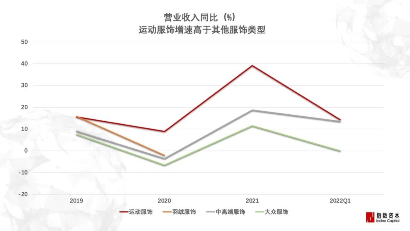 ▲从头部上市公司财务数据来看,运动类服饰优势显著(图源:指数资本)