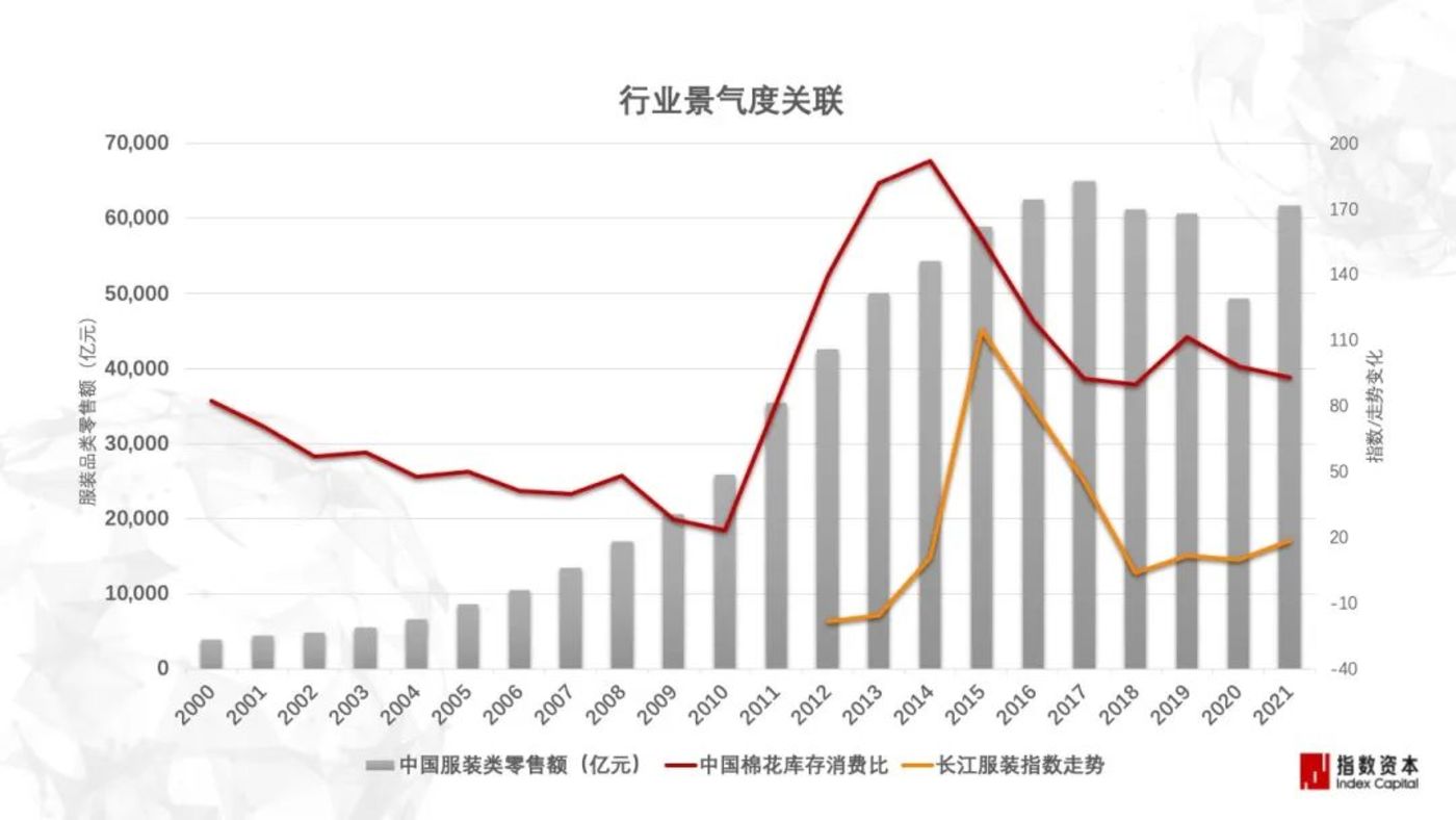 当把2000年以来的中国服装零售额、棉花库存消费比结合分析,指数资本发现了服装行业的一则周期规律:棉花库存消费比与终端零售额呈正相关趋势,并呈现7年前置周期;在棉花库存消费比拐点,反映供需变化,易出现行业机会。