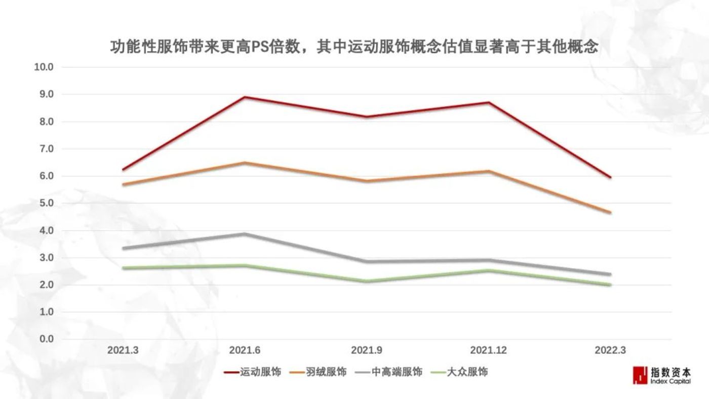 ▲各类功能性服饰PS倍数均高于大众服饰(图源:指数资本)