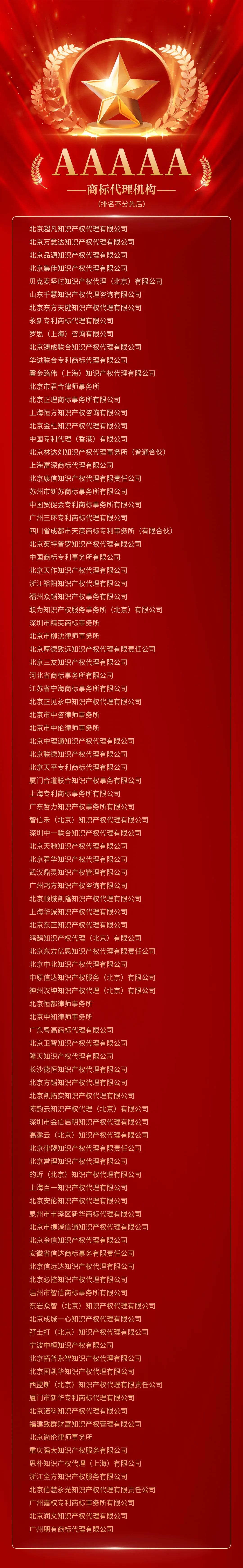 中华商标协会会长马夫表示,截至今年6月底,32000余家商标代理机构在国家知识产权局商标局进行备案,《600强》榜单通过相关指标对备案机构的整体业务数据进行汇总,其中600家商标代理机构分别被评为商标代理服务能力5A、4A和3A机构。《600强》榜单通过提高优质代理服务机构的辨识度,推动代理行业以优质服务为竞争手段,防止“劣币驱良币”,营造良好的行业竞争环境。