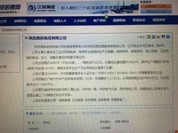 行业网站“线缆招聘网”上的一则招聘信息则称,陕西奥凯电缆有限公司前身是具有10年历史的西安奥凯电缆有限公司。澎湃新闻反复查阅陕西奥凯电缆公司官网,并未发现该公司关于“前身”的描述。