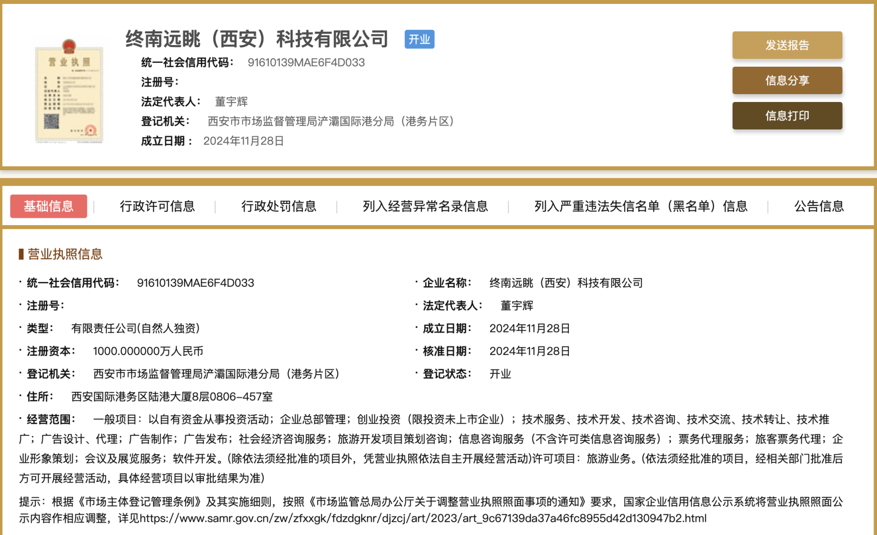 官网显示,长歌有和公司经营范围包含社会经济咨询服务、旅游开发项目策划咨询、票务代理服务、旅客票务代理、软件开发、旅游业务等。公司注册资金100万人民币,董宇辉持股99.9%,终南远眺持股0.1%。