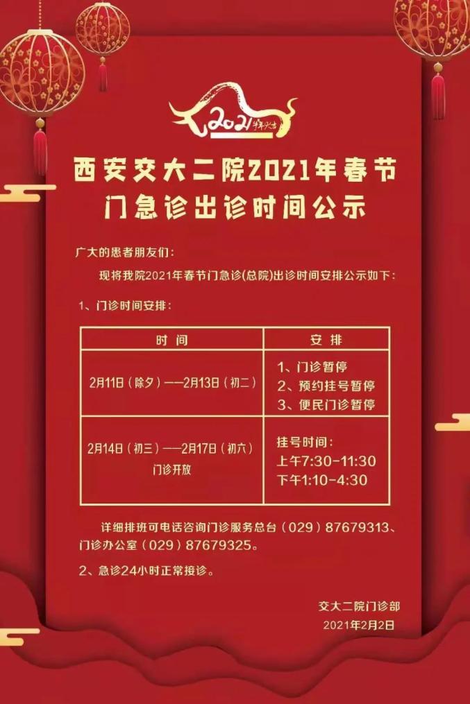 2021年2月11日(除夕)— 2月13日(初二)门诊停诊;2月14日(初三)— 2月17日(初六)门诊开放。